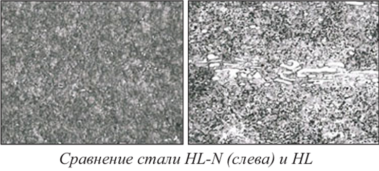 Например, для изготовления цельных фрез HL мы используем специальную высоколегированную сталь, а наше производство поддерживает самые тесные связи с ведущими сталелитейными заводами Швеции. Вот один из результатов такой совместной деятельности: нашими специалистами была разработана сталь HL-N. На фотографии металлографических исследований с увеличением в 500 раз видно, что на 20% уменьшились размеры зёрен, что свидетельствует о значительном повышении изотропности и качества материала. К тому же в нем на 10-12% меньше остаточного аустенита.
